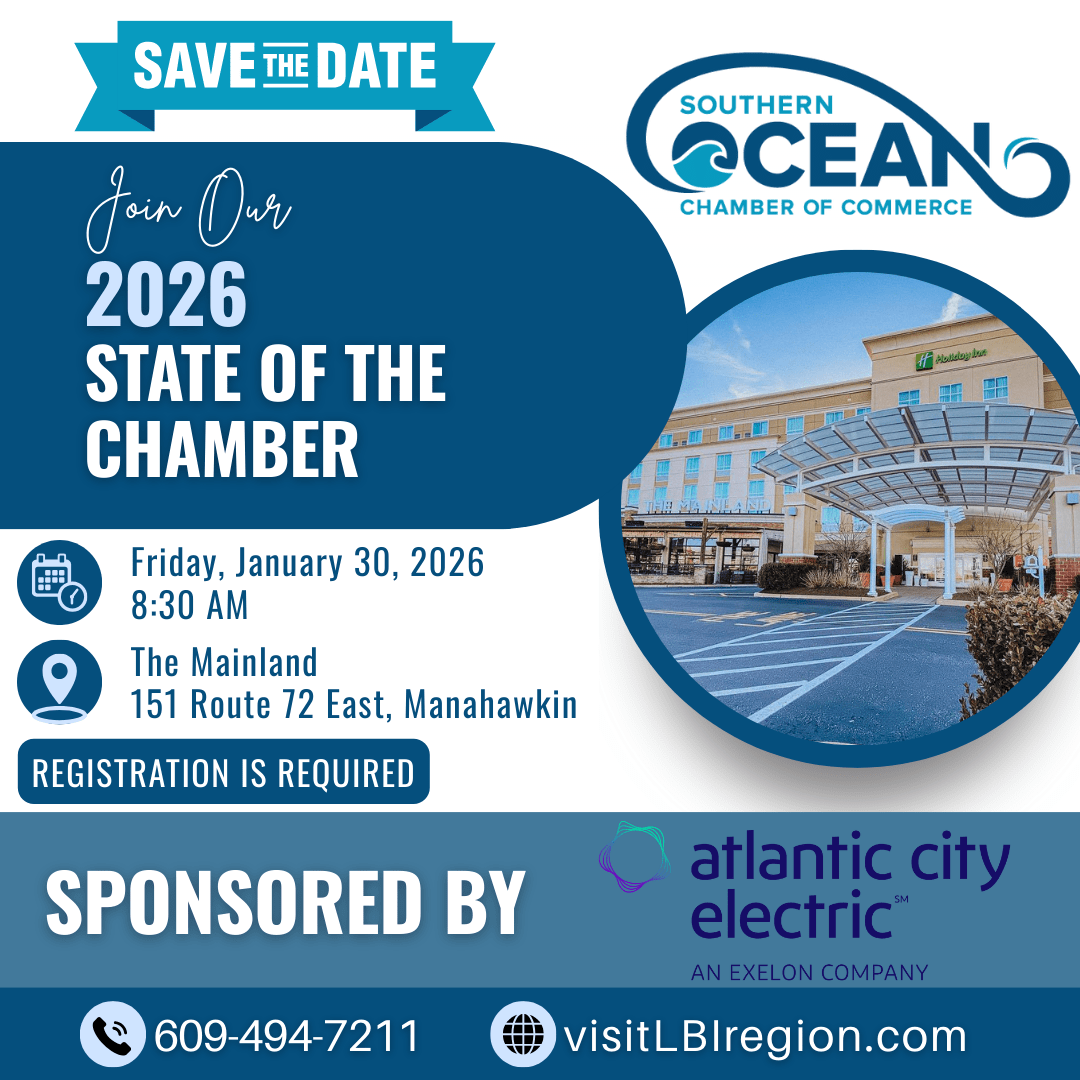 The Southern Ocean County Chamber of Commerce is proud to present the January 2026 State of the Chamber, a signature event that sets the tone for the year ahead. Scheduled for Friday, January 30, 2026, at 8:30 AM, the gathering will take place at The Mainland in Manahawkin, offering attendees a full breakfast buffet, valuable networking opportunities, and a dynamic program.