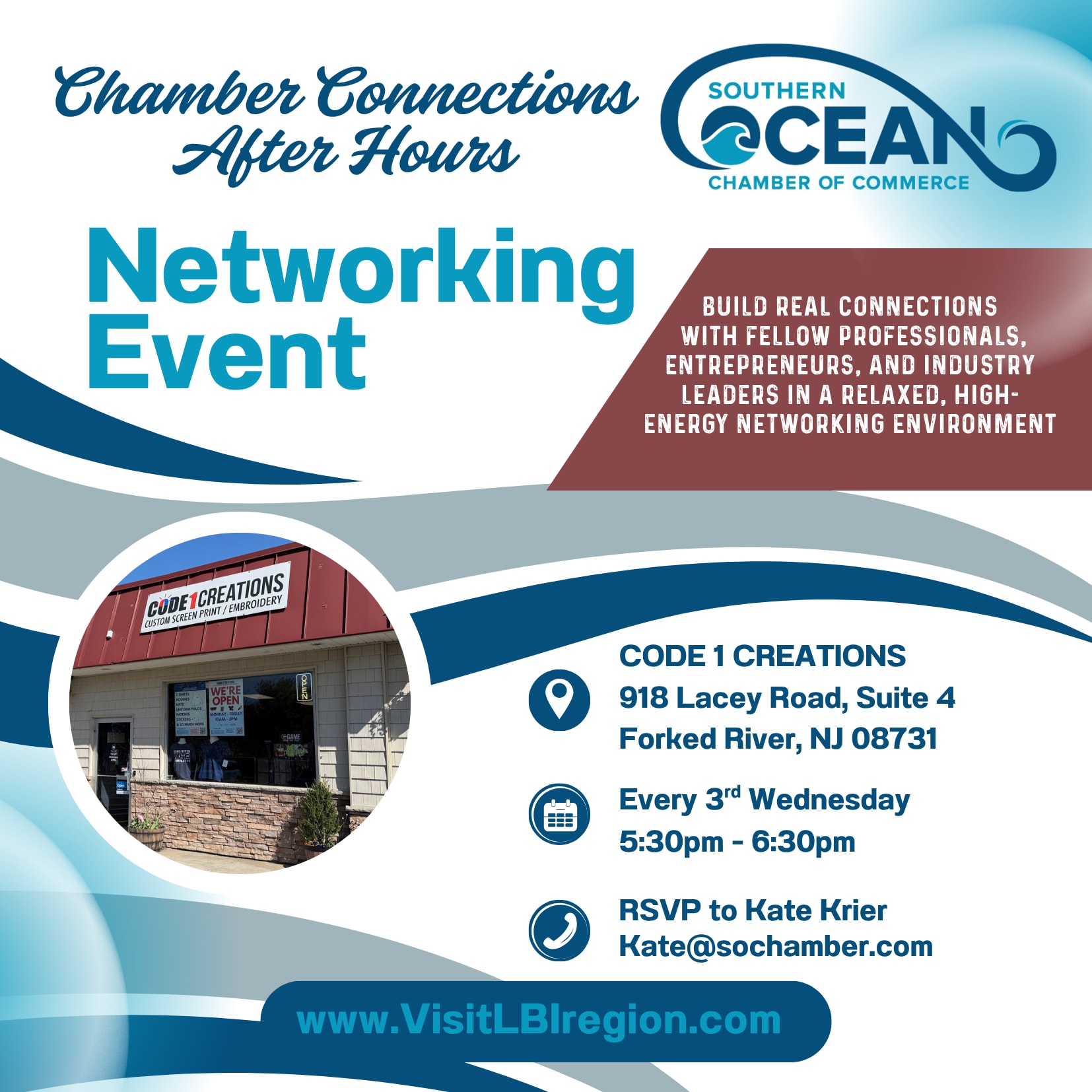 Grow Your Business Community October 15 at Code 1 Creations Calling all Professionals doing business in Southern Ocean County. Join the regional chamber at the Chamber Connections Networking Event hosted at Code 1 Creations on Wednesday, October 15, 2025, from 5:30 PM to 6:30 PM at 918 Lacey Road, Suite 4, Forked River. Drop in to enjoy refreshments and engage in conversations. Be sure to bring your business card to enter a drawing to win a dozen custom screen-printed shirts (one-color front & back print) This event is perfect for those who are looking to grow their network and share ideas. Don't miss out on this fantastic opportunity to connect with like-minded peers in a relaxed and friendly environment. FREE for Southern Ocean County Chamber Members. Non-members $10 at the door. RSVP to Kate@sochamber.com to secure your spot. For more information, contact the Southern Ocean County Chamber of Commerce at 609.494.7211 x 104 or visit www.visitLBIregion.com.Images