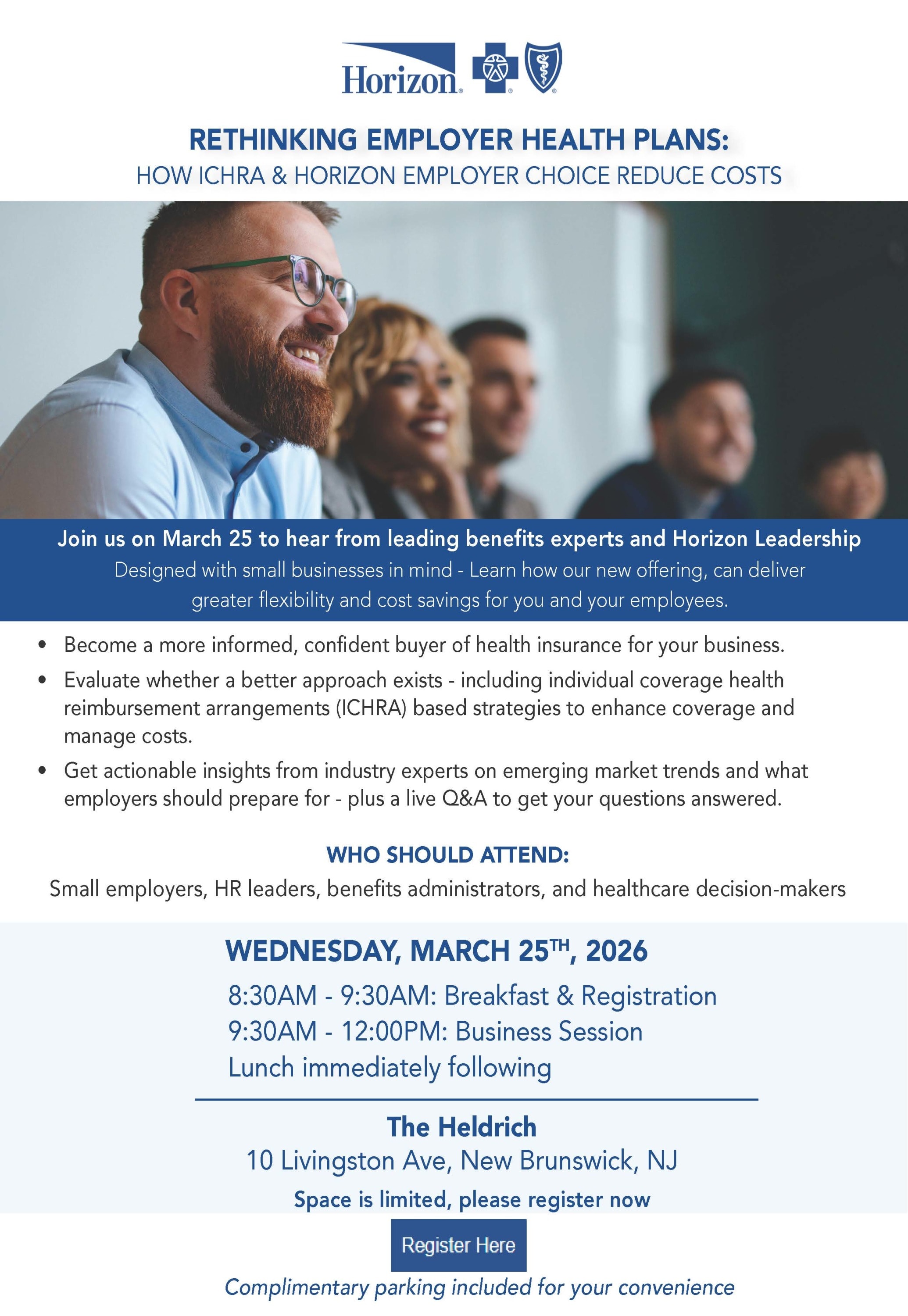 Horizon would like to exclusively invite Small/Midsize employers, HR leaders, benefits administrators, and healthcare decision makers from within the Chamber for breakfast, lunch and exclusive insights about our ICHRA product at The Heldrich in New Brunswick 03/25/2026 from 8:30am – 12:00pm. Horizon will be discussing our ICHRA product. (Individual Coverage Health Reimbursement Arrangement) ICHRA is a tax advantage to any business owner and increases employee retention, with the capability to offer a stipend to the employee to use towards their Individual Health Coverage to make it more affordable. All attendees that wish to register can contact Joe at 862-410-9249 or via email at joseph_talerico@horizonblue.com.Images