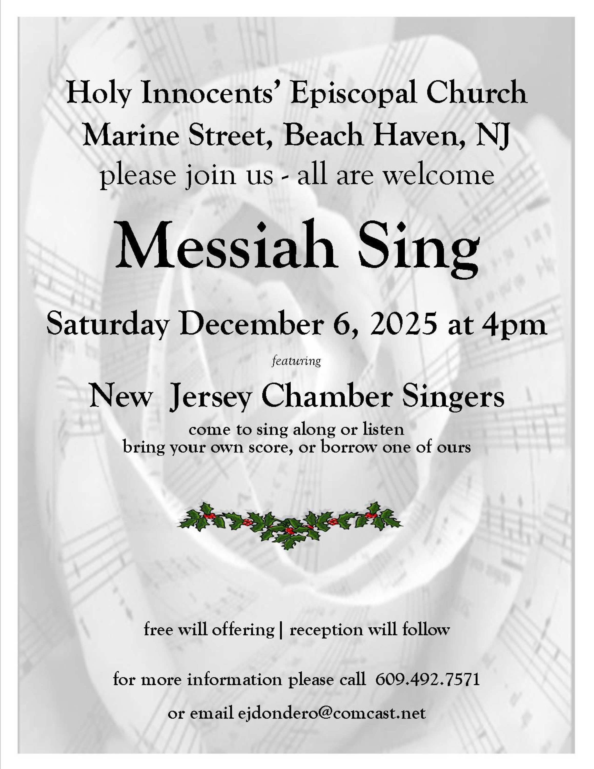 Messiah Sing, with guest artists the New Jersey Chamber Singers with Artistic Director and Conductor Mr. Zabiegala accompanied by Karen Miske on the beautiful Allen Organ. In addition to the Messiah Sing, New Jersey Chamber Singers will perform a set of selections from their program “Light in Winter.”