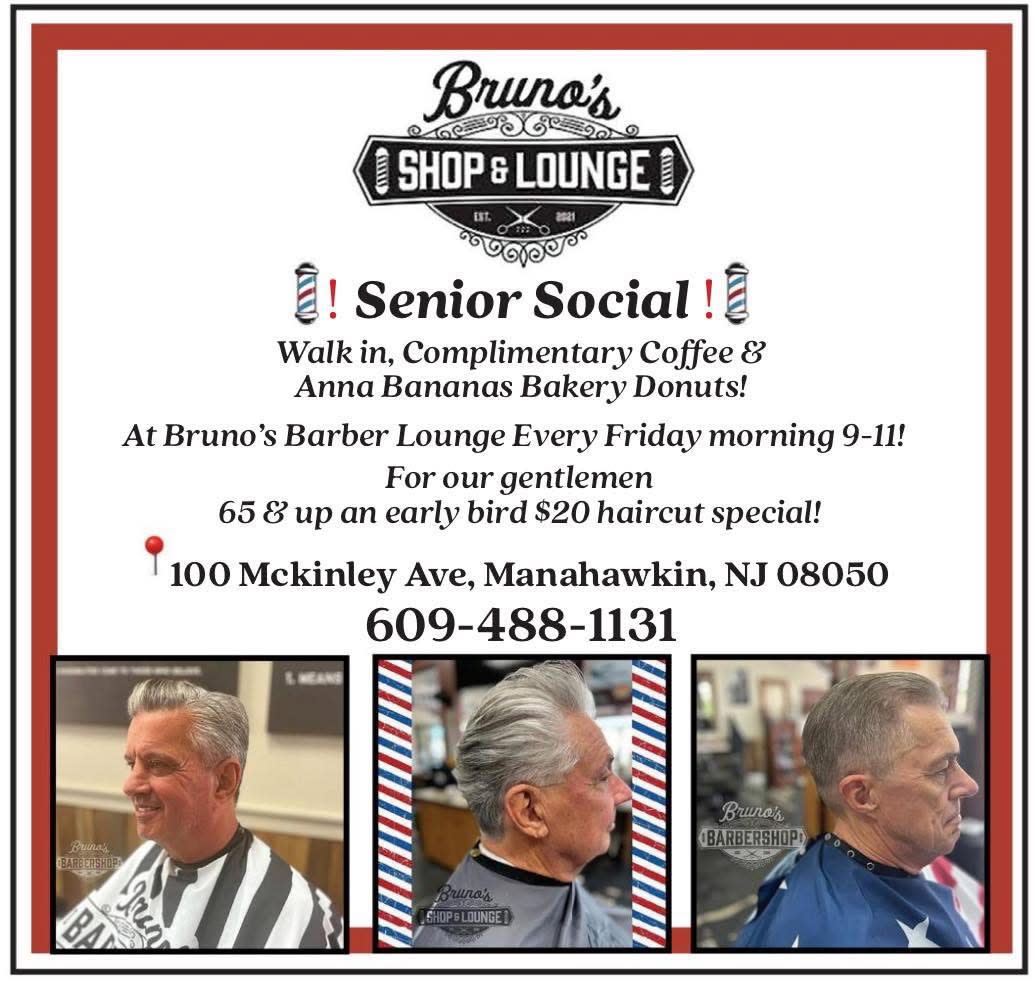 Walk in, Complimentary Coffee & Anna Bananas Bakery Donuts! At Bruno's Barber Lounge Every Friday morning 9-11am. For our gentlemen 65 & up, an early bird $20 haircut special!
