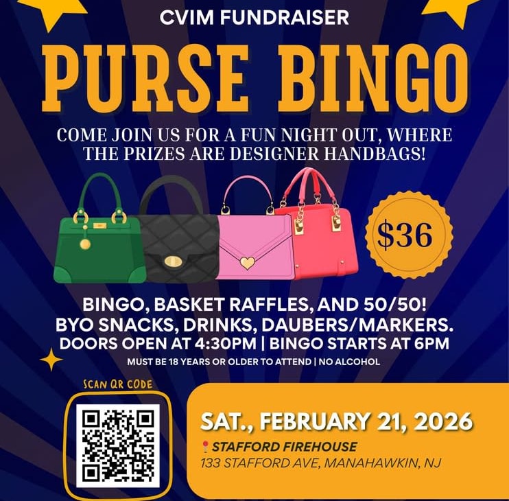Join Coastal Volunteers in Medicine for a fun night out where the prizes are designer handbags, all while supporting free healthcare for the uninsured in Ocean County. 📅 Saturday, February 21, 2026 📍 Stafford Firehouse | Manahawkin, NJ 🕟 Doors open 4:30 PM | Bingo starts 6:00 PM 🎟️ $35 per ticket. BINGO, Basket Raffles, and 50/50! BYO Snacks, Drinks, Daubers/Markers. 🥤 BYO snacks, drinks & daubers 🔞 Must be 18+ | Alcohol-free event 💙 Proceeds support free medical care through CVIM 📧 For tickets: please visit: www.CoastalVIM.org/purse-bingo/