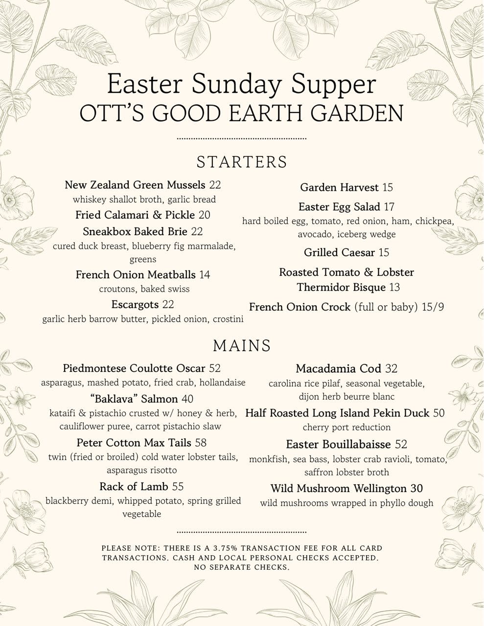Join us for Easter Sunday Brunch Buffet & À La Carte Dinner at The Garden. 📅 April 5, 2026 🍽 Brunch Buffet: 11:00 AM – 2:00 PM - Menu Below ⤵️ ◾Adults $50, 12 & Under $25 🍽 À La Carte Dinner: 4:00 PM – 7:00 PM Make Your Reservations Online here: https://www.ottsgoodearthgarden.com/