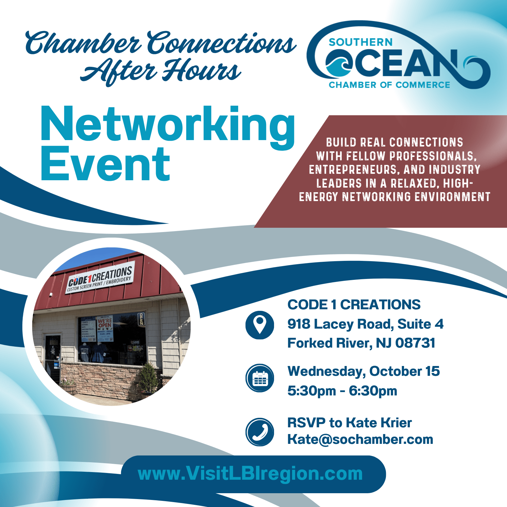 Calling all professionals doing business in Southern Ocean County—mark your calendar for the Chamber Connections Networking Event, hosted by the Southern Ocean County Chamber of Commerce at Code 1 Creations on Wednesday, October 15, 2025, from 5:30 PM to 6:30 PM. The event will take place at 918 Lacey Road, Suite 4, Forked River.