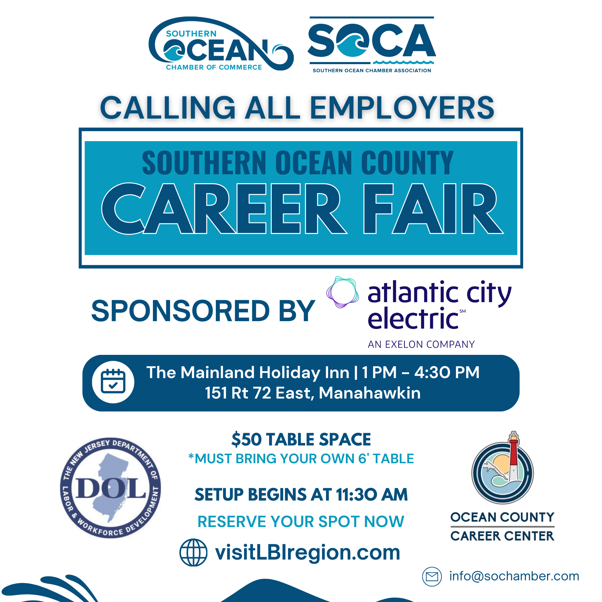 Businesses are excited to join regional, county and state employers to advance the Southern Ocean County workforce at the premier job fair happening March 12 at The Mainland in Manahawkin. The Southern Ocean Chamber, along with partners Ocean County Career Center, NJ Department of Labor & Workforce Development, and Atlantic City Electric are bringing local businesses together in the 9,000 sq.ft grand ballroom for the first comprehensive job fair, targeting both full and part-time candidates for career-advancing positions. This centrally located regional event is designed to bring together resources, job seekers, veteran employment services and employers to benefit Southern Ocean County and our coastal community.