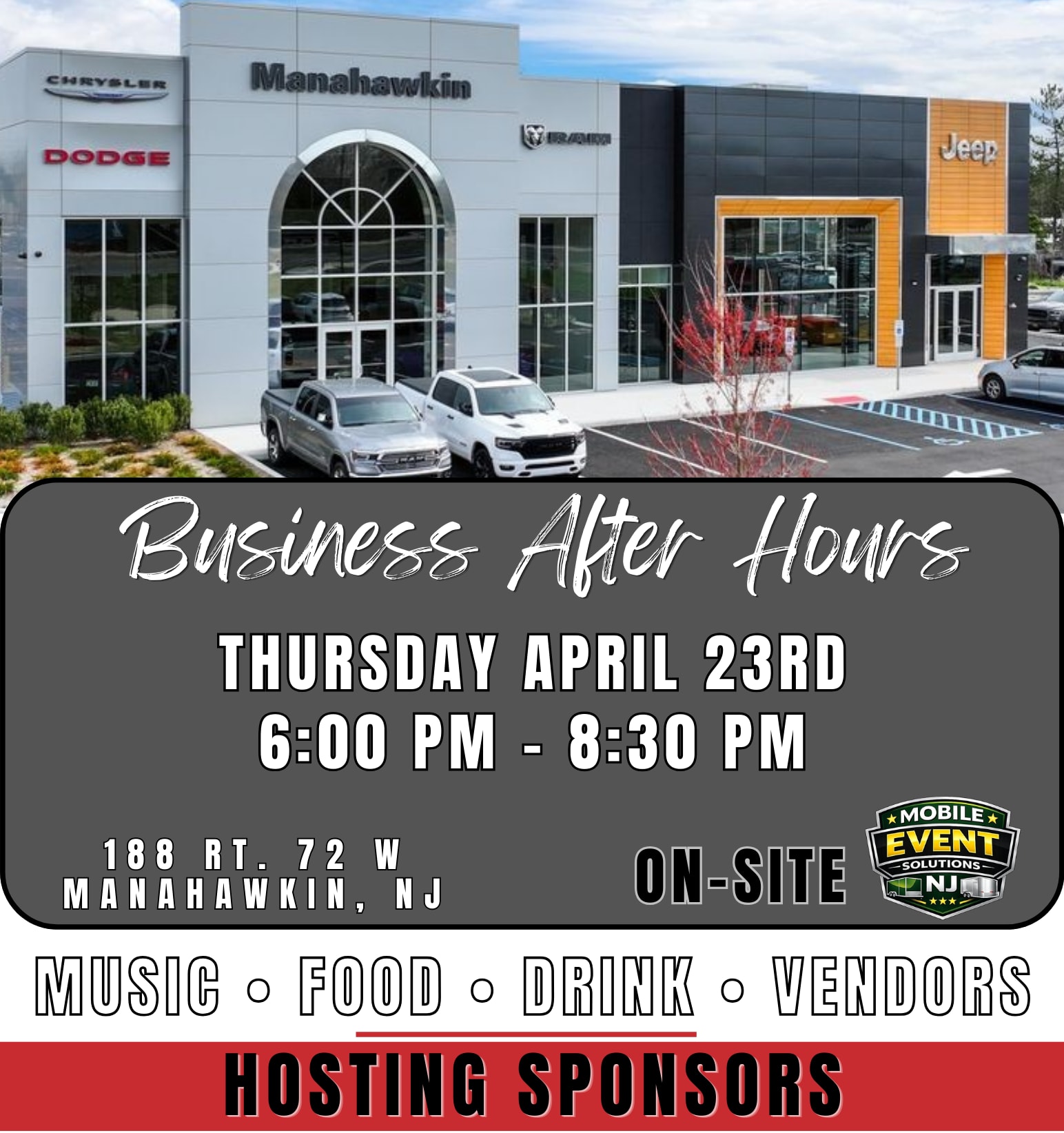 Shift your business networking into high gear at the Southern Ocean Chamber’s Spring Drive Business After Hours, an evening designed to bring local professionals together inside the brand‑new Manahawkin Chrysler, Dodge, Jeep Ram and Kia dealership. Guests will enjoy a relaxed after‑hours environment featuring networking opportunities, a guided showroom tour, and a fantastic menu complete with complimentary food and beverages happening Thursday, April 23 from 6:00–8:30 PM at 188 Route 72, Manahawkin, NJ. This special event highlights the dealership’s new facility and showcases a wide variety of business‑ready inventory. Mobile Event Solutions NJ will be there to elevate the experience with their interactive golf trailer, streaming sports TV trailer, and demonstrations of how their mobile staging and event trailers can transform corporate and community events. Catering for the event will be provided by The Gourmet Deli.